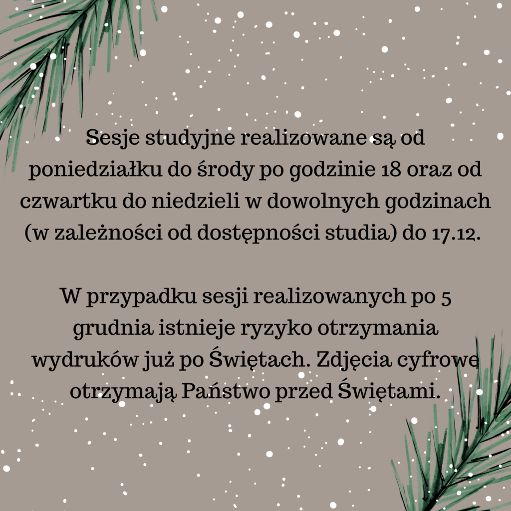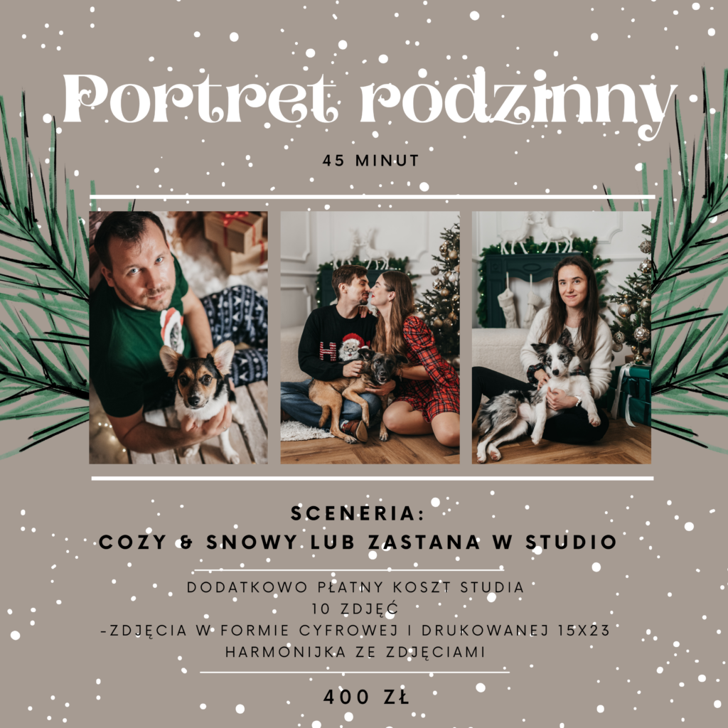 SESJA ŚWIĄTECZNA Strona główna PRZYKŁADOWE REALIZACJE Wszystkie Psi portret Portret rodzinny Świąteczne miasteczko INFORMACJE DODATKOWE